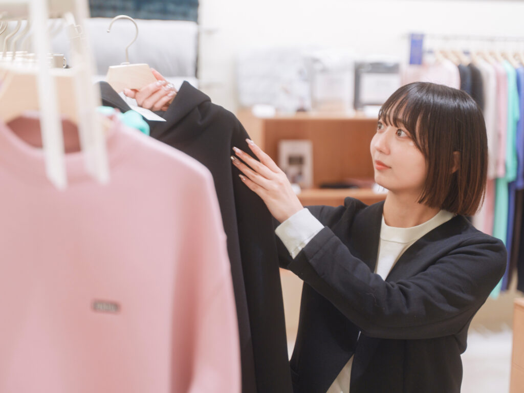 お客様から「実際どうですか?」と聞かれることも多いんですが、そこは答えないように気をつけています。そのぶん、店舗でしかできないことを大切にしています。例えば、生地感を実際に触っていただくことや、スタッフと直接話しながら疑問を解消できることなど、オンラインでは分りにくい部分を、できる限りお伝えするよう意識しています。